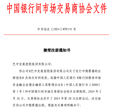 2月28日,巴中發(fā)展控股集團成功獲得中國銀行間市場交易商協(xié)會出具中期票據(jù)注冊的批文(中市協(xié)注〔2024〕MTN191號),注冊金額20億元,批文有效期2年,這是巴中發(fā)展控股集團獲評AA+主體信用等級以來又一重大突破。下一步,巴中發(fā)展集團將密切關(guān)注資本市場行情擇機擇期發(fā)行,爭取獲得低利率發(fā)行成本,實現(xiàn)債券首發(fā)成功。